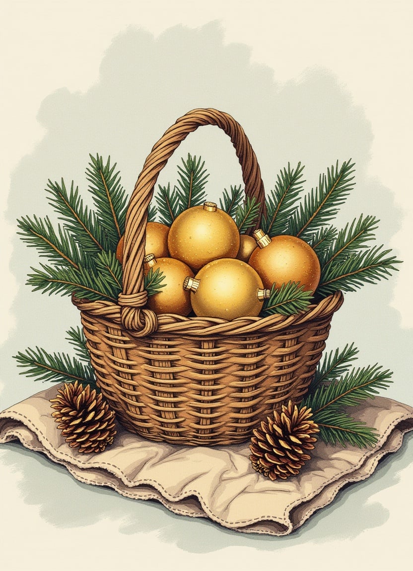 art, basket, branches, brown, christmas, cloth, cream, decor, decoration, festive, gold, holiday, illustration, ornaments, pine, pine cone, season, tree, wicker, winter