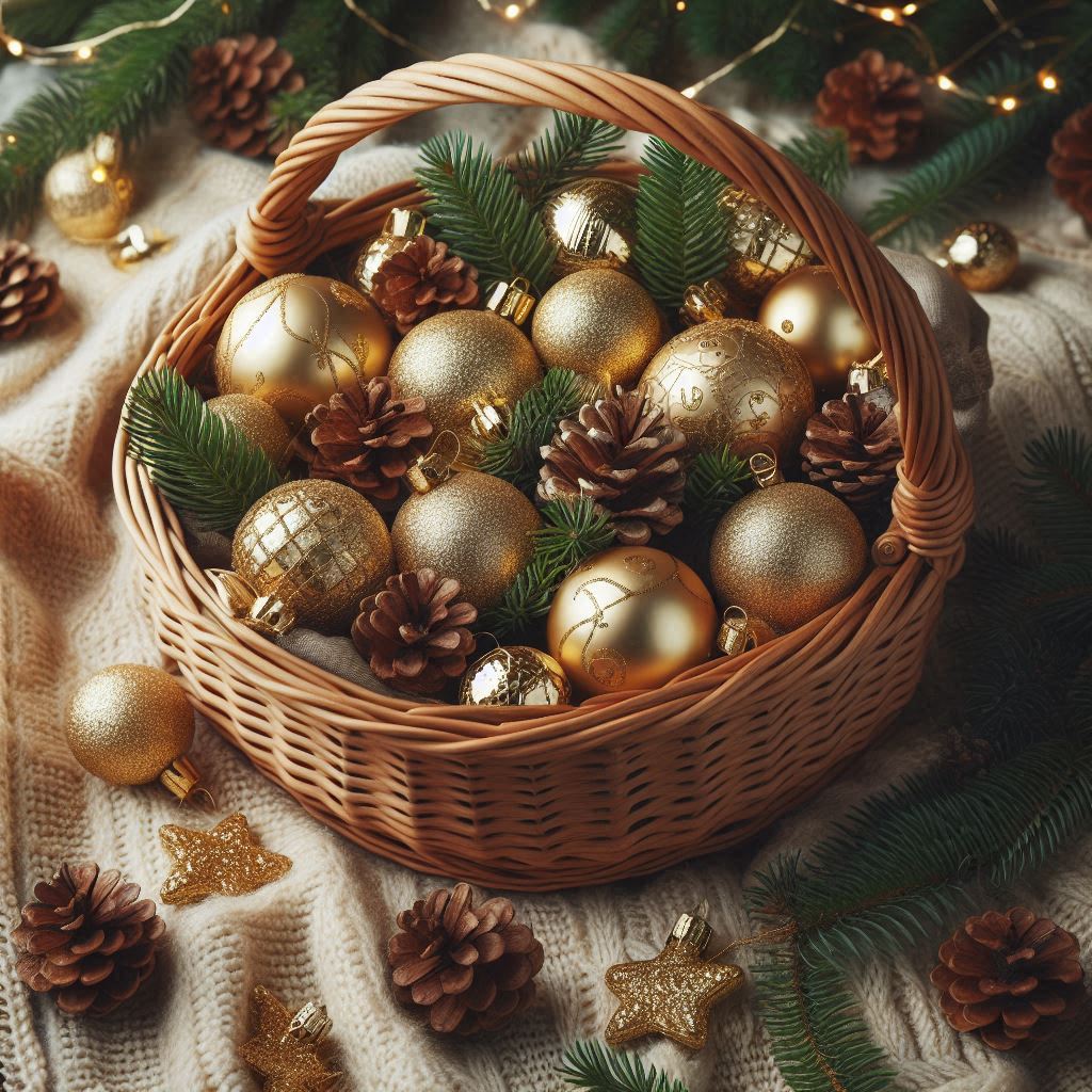 A wicker basket filled with gold Christmas ornaments and pine cones sits on a white blanket. Green pine sprigs are scattered around the basket.