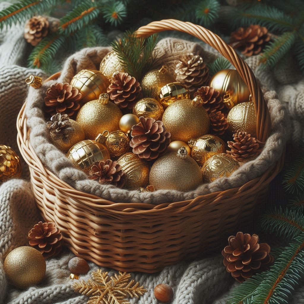 A wicker basket filled with gold Christmas ornaments and pine cones rests on a knitted throw.