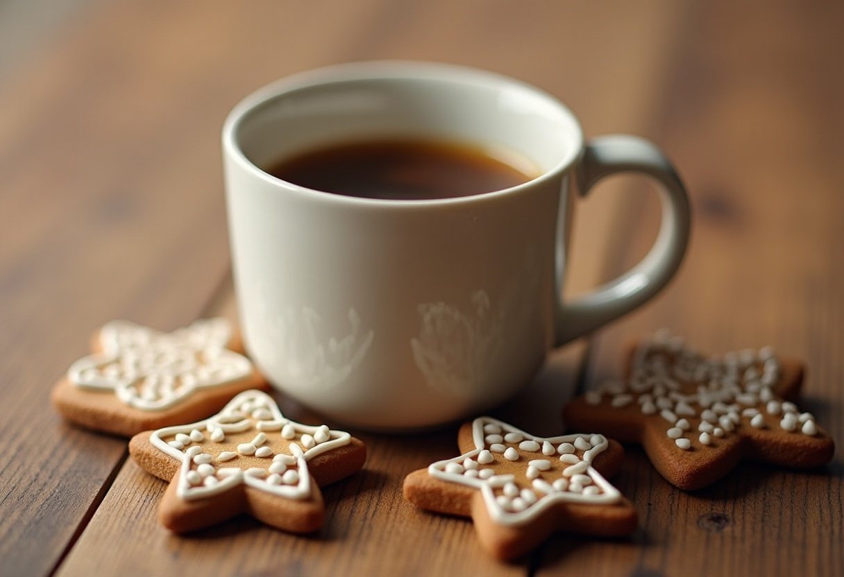beverage, brown, christmas, coffee, cookies, cup, drink, gingerbread, holiday, hot, icing, mug, snack, sprinkles, star, sweet, table, treat, white, wooden