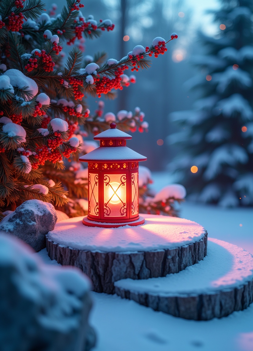 berries, christmas, cold, cozy, evening, forest, glow, holiday, landscape, lantern, light, nature, night, outdoors, red, snow, stump, tree, warm, winter