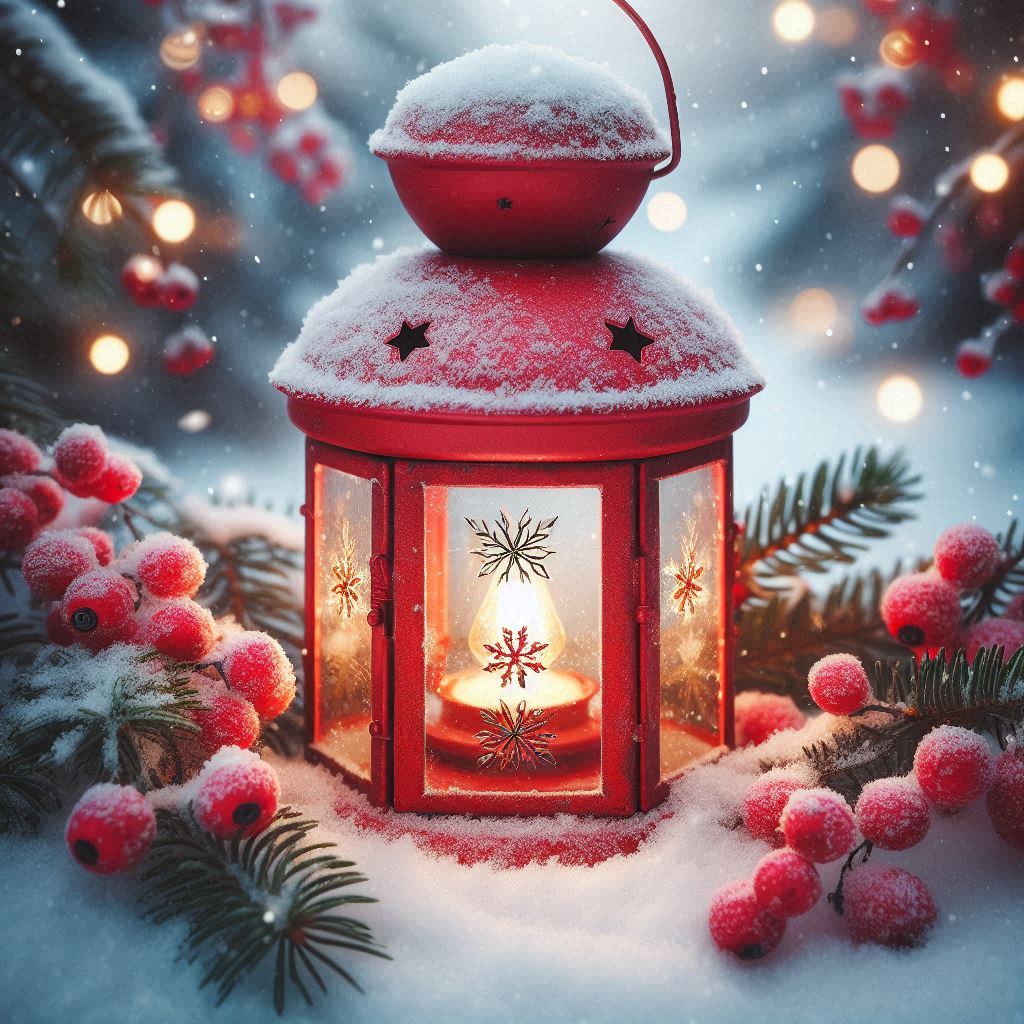 A red lantern sits on a bed of snow with a small flame flickering inside. Snow-covered branches with red berries surround the lantern.