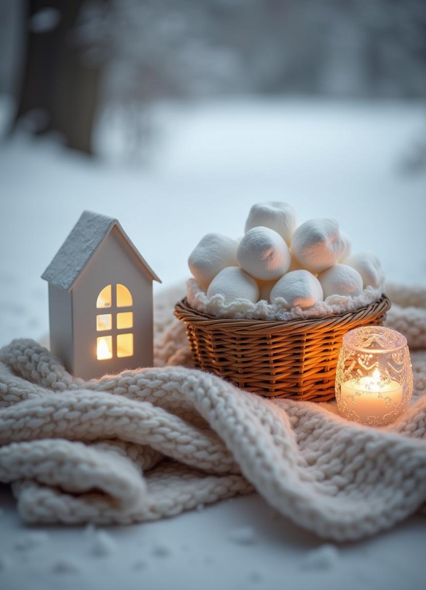 basket, blanket, candle, comfort, cozy, cute, festive, holiday, home, house, light, marshmallows, miniature, relaxing, snow, soft, warm, white, winter, winter scene