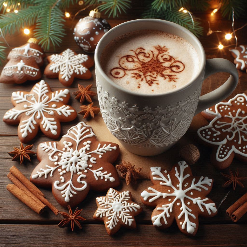A white mug of hot cocoa with a snowflake design sits on a wooden table surrounded by gingerbread cookies decorated with white icing.