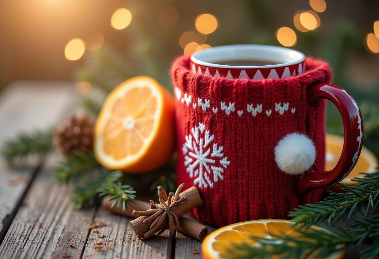 A red mug with a knit cozy and a white pom pom on the handle sits on a wooden table surrounded by oranges, cinnamon sticks, and pine branches.