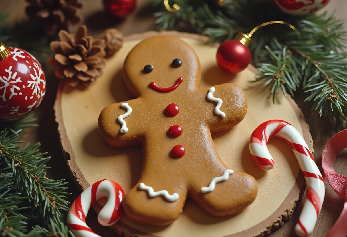 A gingerbread man cookie sits on a wooden platter with two candy canes, pine sprigs, and red Christmas ornaments around it.
