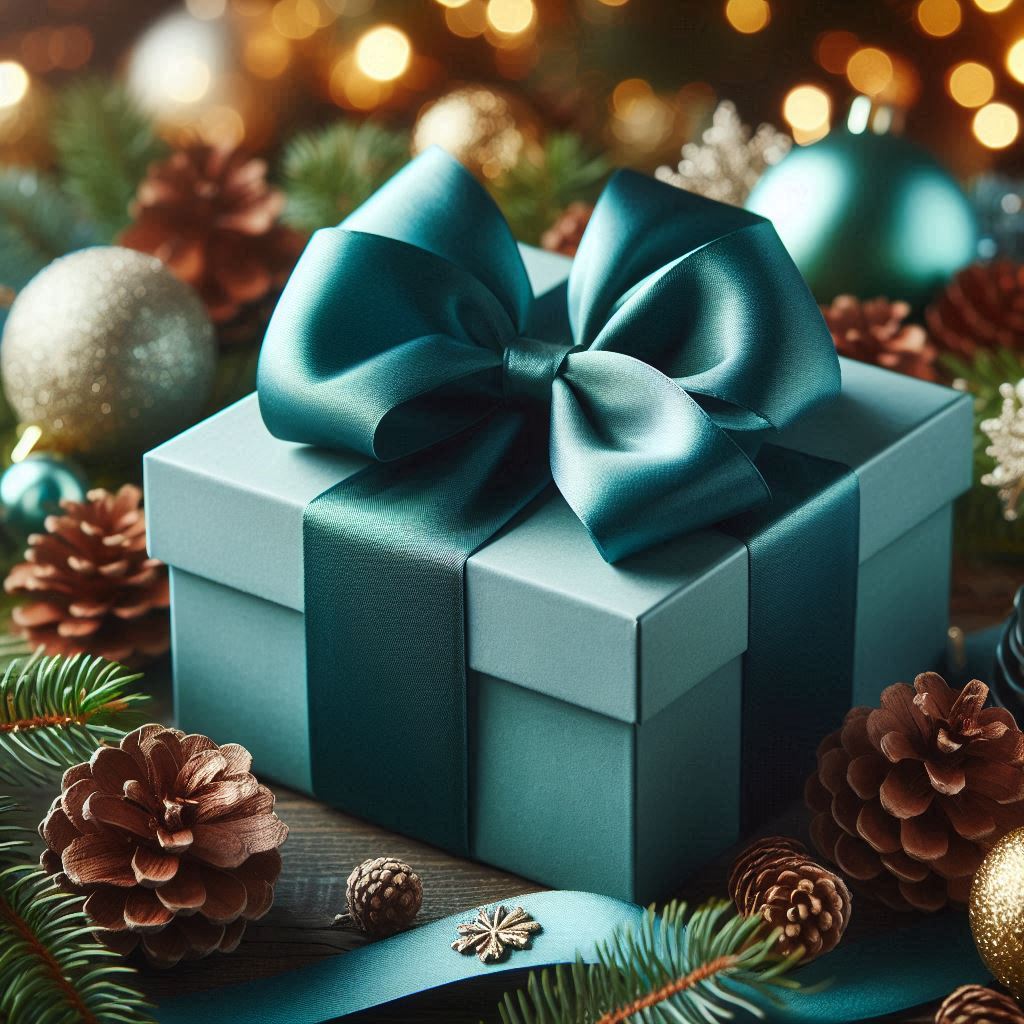 A light blue gift box wrapped with a large teal satin bow sits on a wooden surface. It is surrounded by pine branches, pinecones, gold and turquoise Christmas ornaments, and warm bokeh lights. The festive holiday arrangement features rich green foliage and metallic accents.