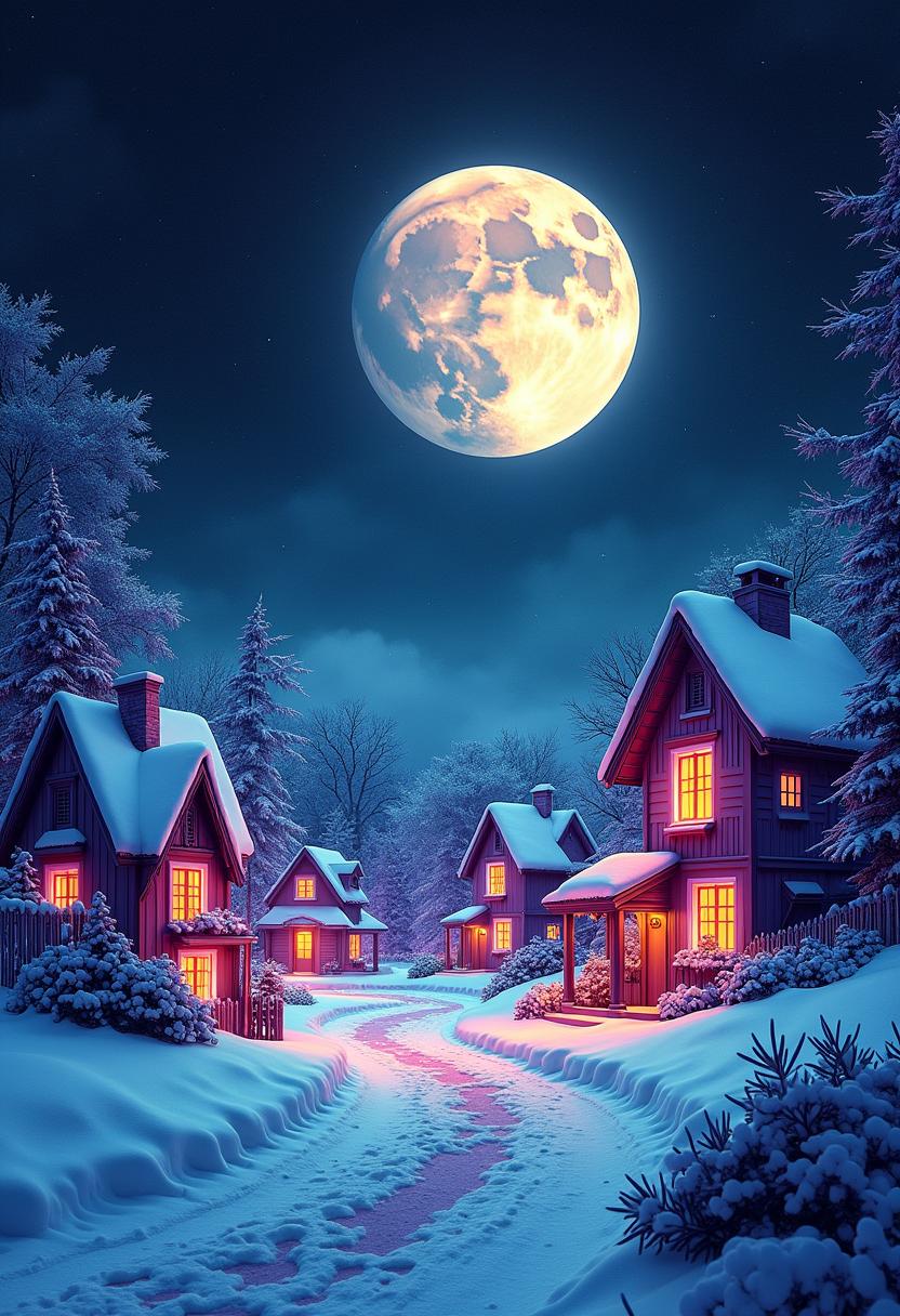 A snowy path winds through a village, with houses illuminated by warm lights. A full moon hangs above, casting a soft glow on the scene.