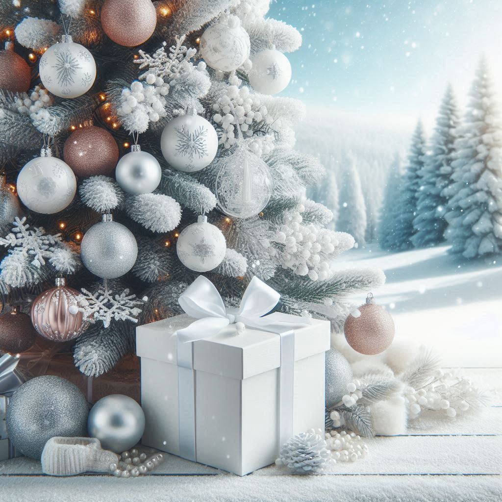 christmas, christmas tree, decor, decoration, festive, forest, gift, gift box, holiday, lights, ornament, present, ribbon, season, silver, snow, snowy, tree, white, winter