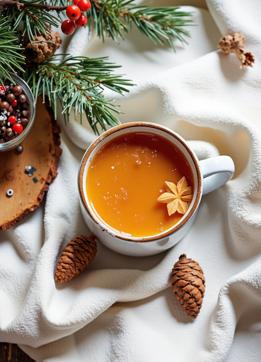Warm cider on a white cloth with pine decor