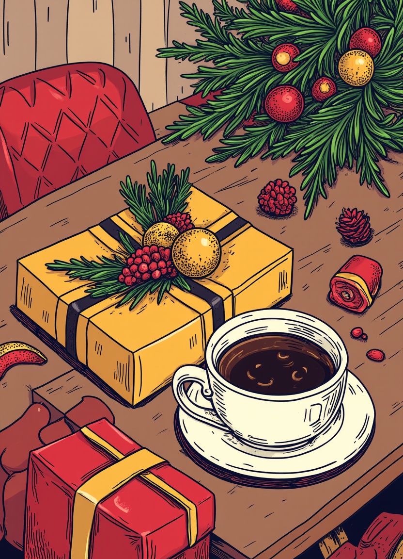 A cup of coffee sits on a wooden table. A wrapped gift adorned with pine boughs and red berries sits next to it.