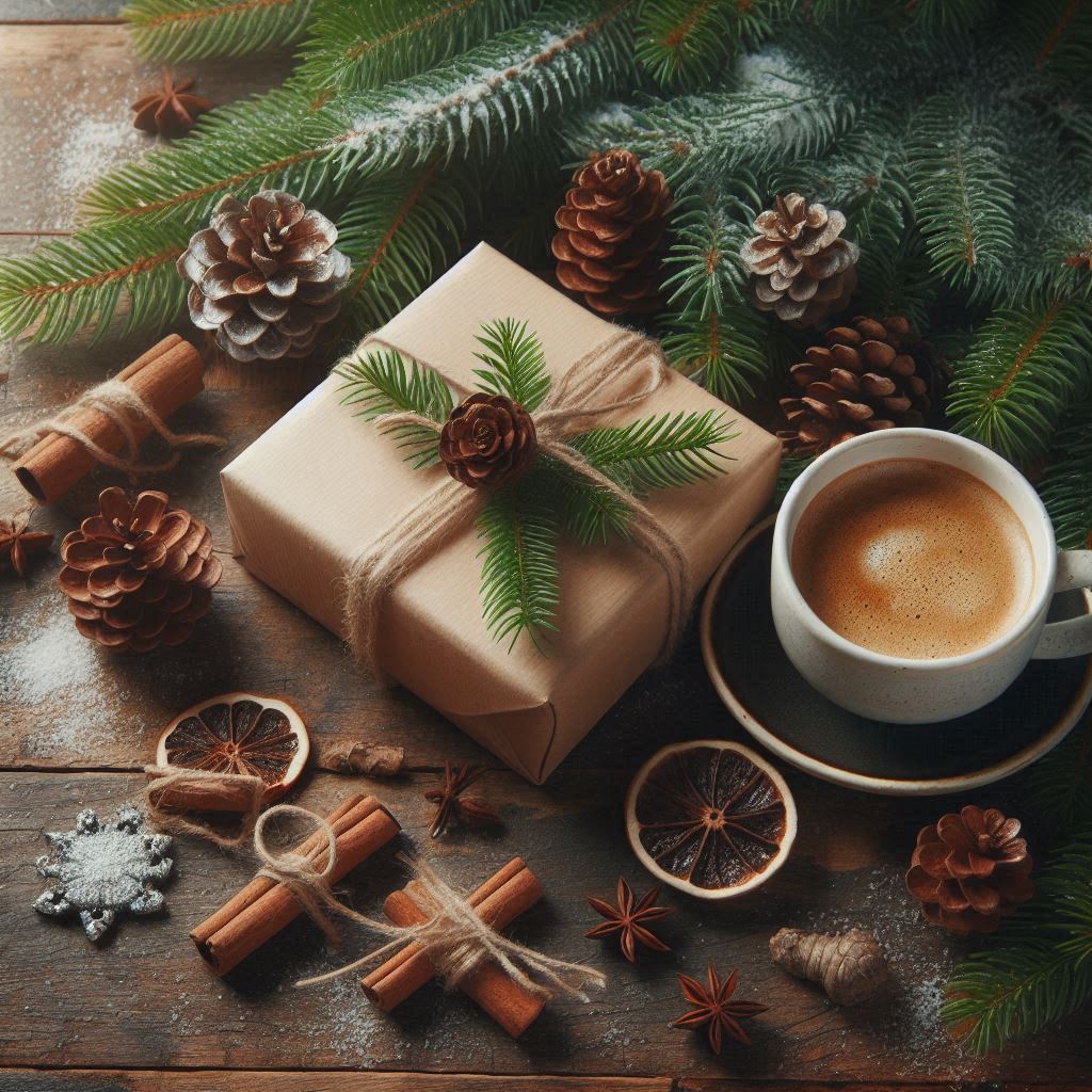 brown, christmas, cinnamon, coffee, cones, cozy, cup, decoration, festive, gift, holiday, pine, relax, sprigs, table, twine, warm, winter, wooden, wrapped