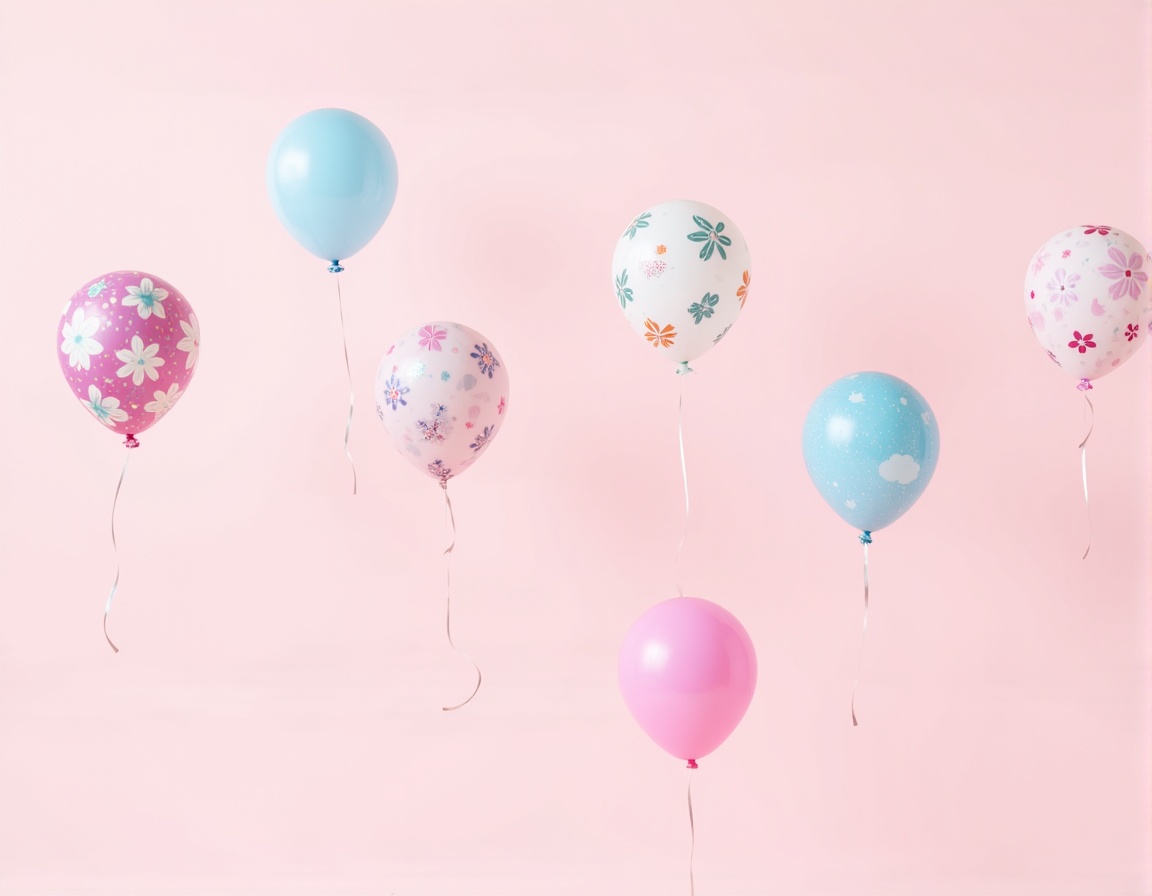 Six balloons, two solid blue, one solid pink, and three with flower designs, are floating against a light pink background.
