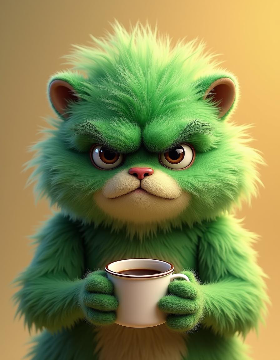 A green, furry, animated creature is holding a white coffee mug with both paws. The creature looks annoyed or grumpy.