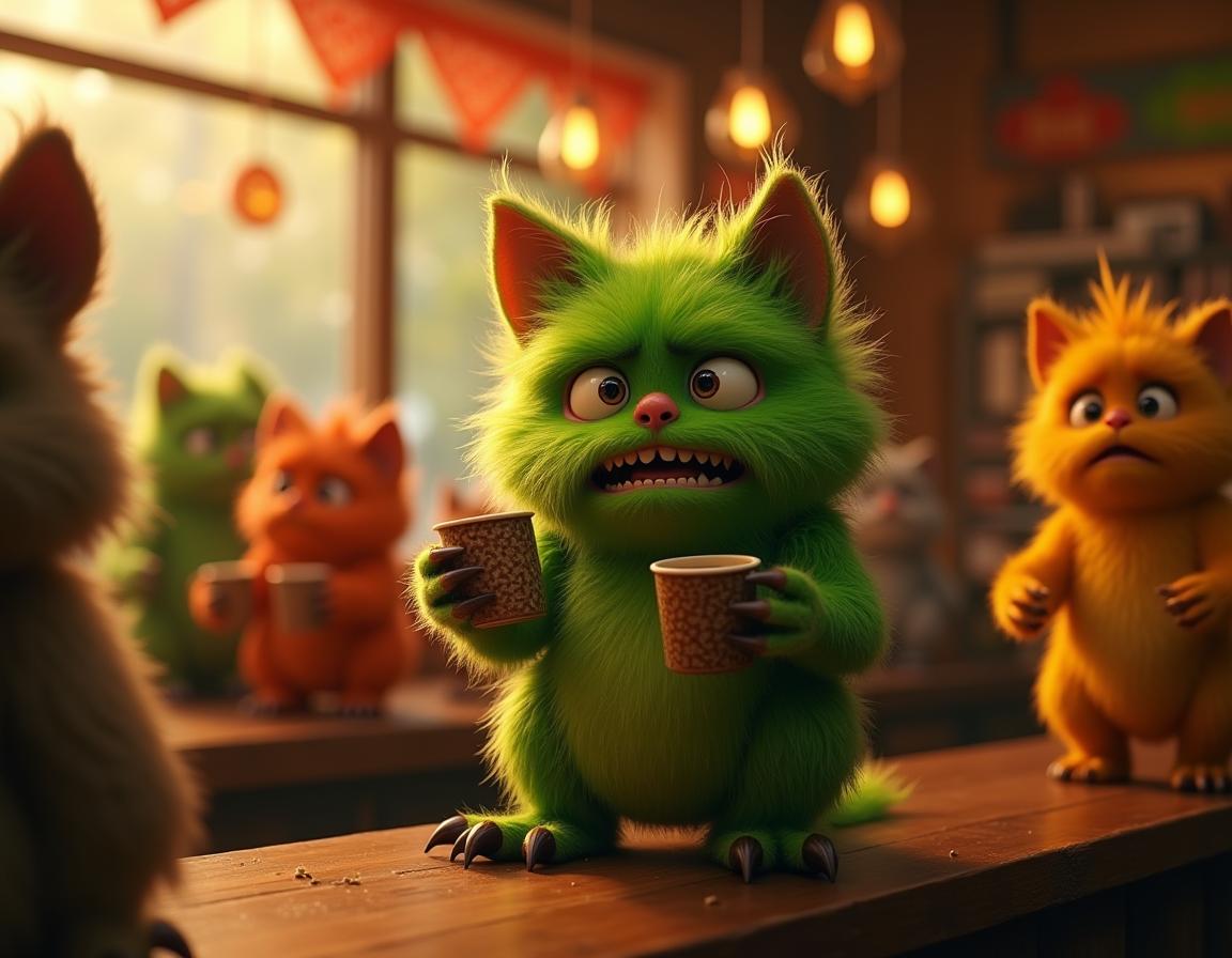 A green furry cat drinks coffee at a cafe