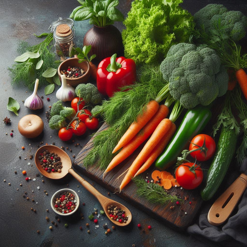 broccoli, carrots, cooking, diet, food, fresh, garlic, healthy, herbs, ingredients, kitchen, meal prep, nutrition, organic, peppers, produce, spices, tomatoes, vegetables, vibrant