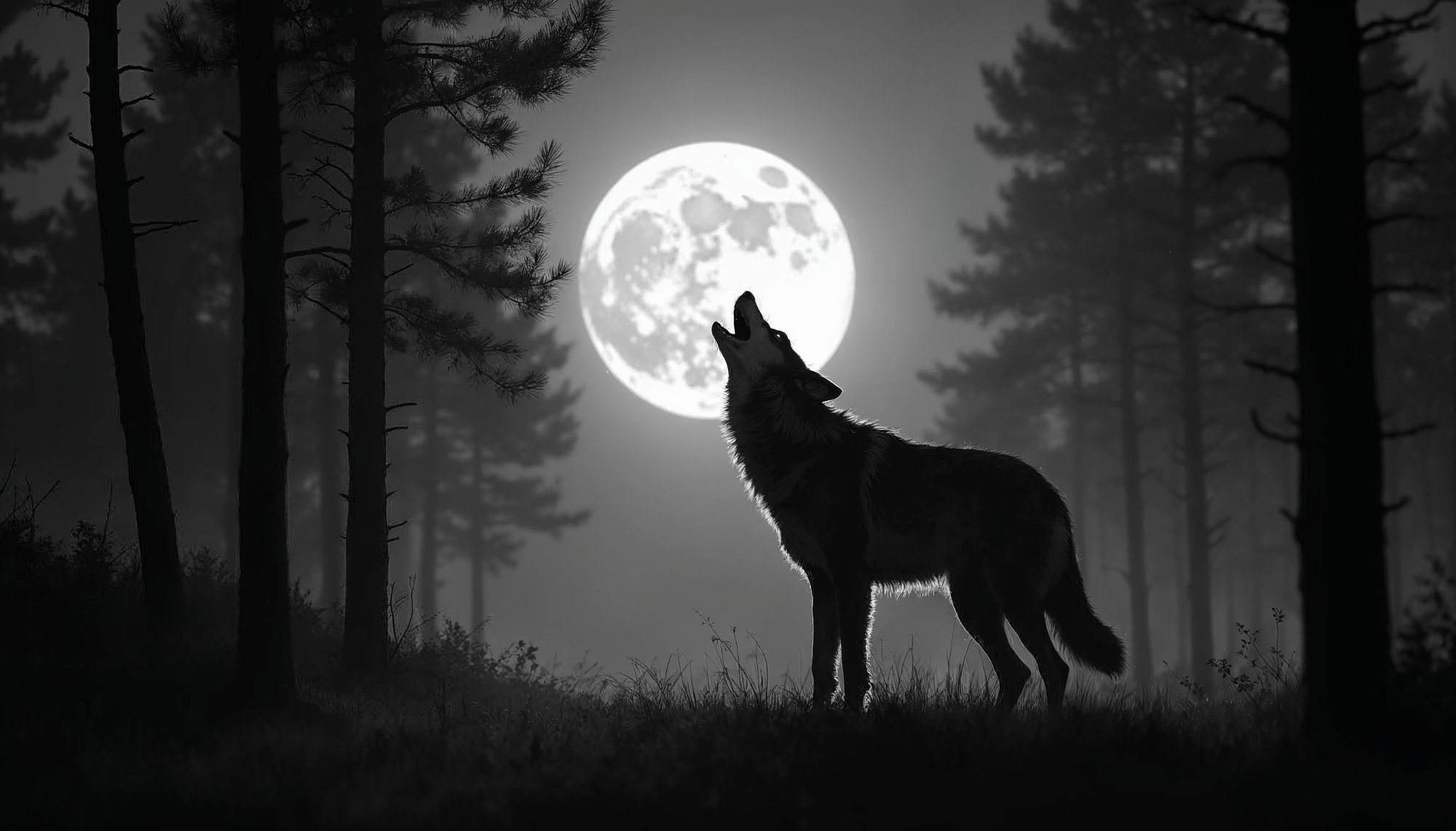 A lone wolf stands in a dark forest silhouetted against a large full moon. The wolf howls, its head tilted back. Tall trees surround it.