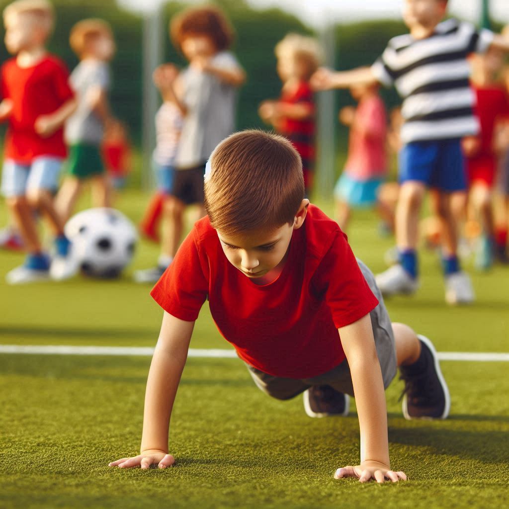Young boy doing push-ups on a sports field with peers