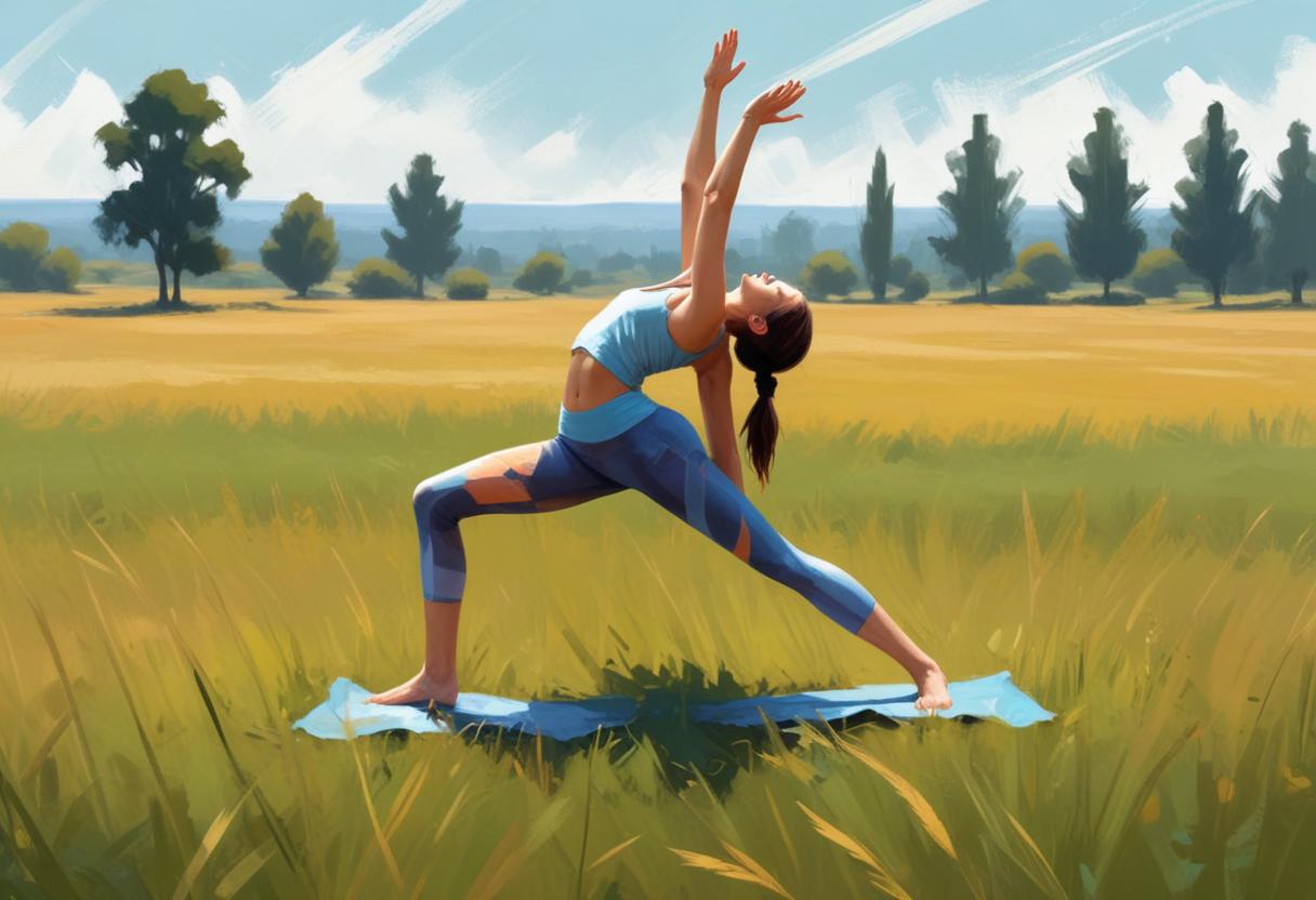 A woman performs yoga in a lush green field under a clear sky, embracing the tranquility of nature during her daily routine.