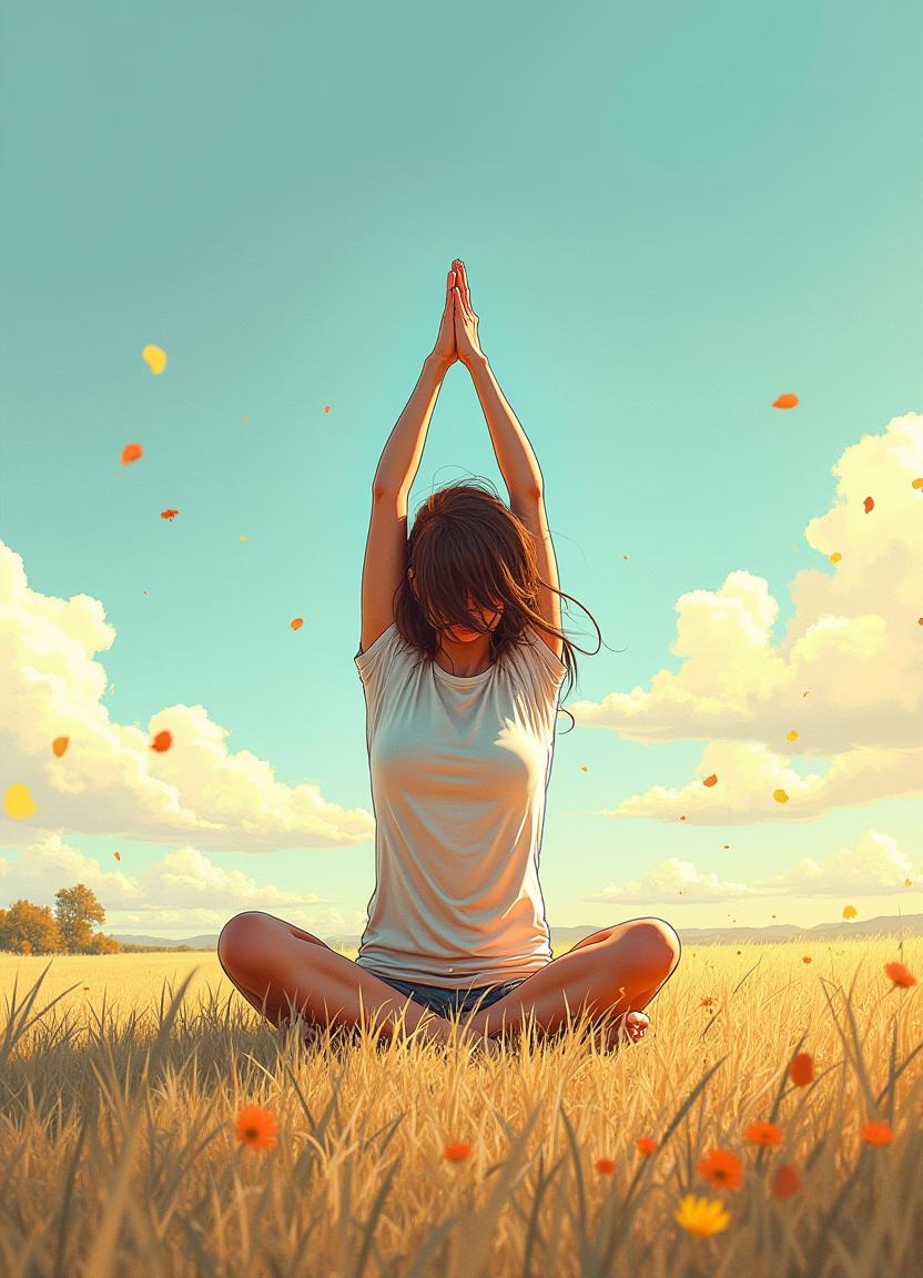 A person sits cross-legged in a field, practicing yoga with arms raised. The sky is blue with soft clouds, creating a peaceful atmosphere.