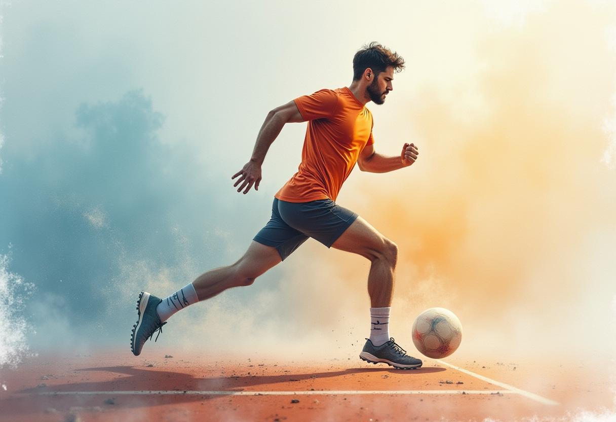 A young man in an orange shirt runs energetically on a court, focused on a soccer ball in a vibrant, colorful atmosphere.