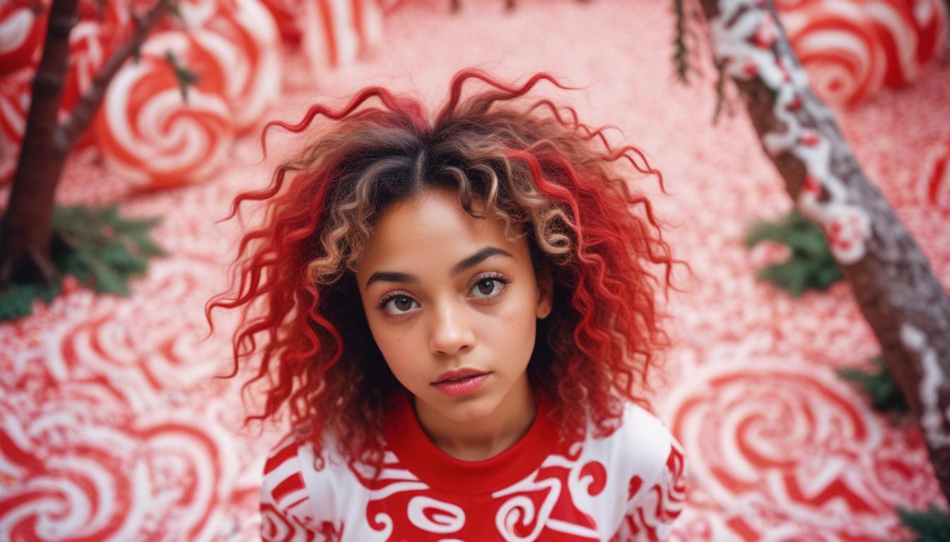 A young person stands amidst swirling red and white patterns, showcasing vibrant hair and a striking outfit in a whimsical candy-inspired environment.