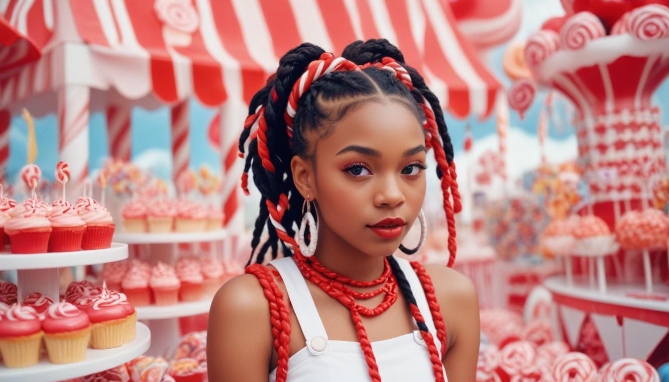A girl stands in a vibrant candy-themed environment, showcasing colorful treats and decorations. Her hairstyle features playful red and white braids.