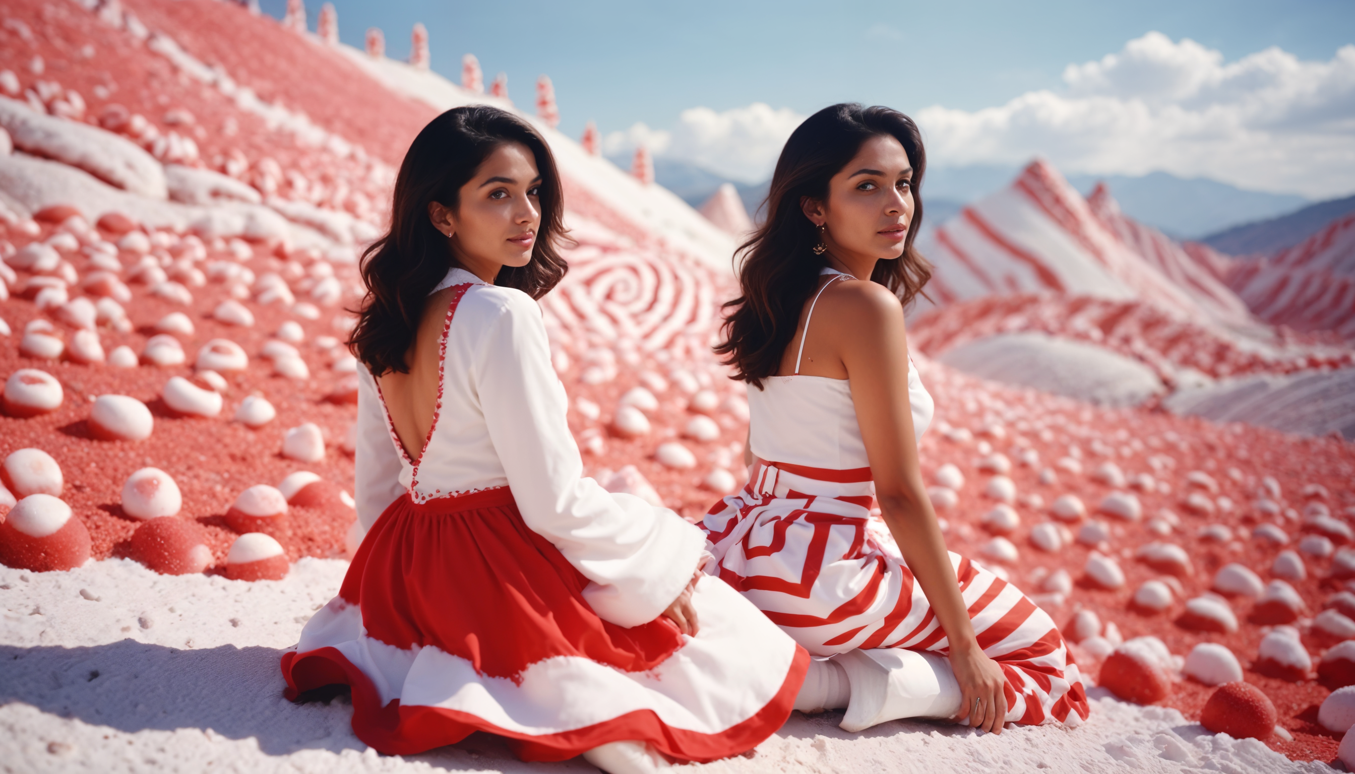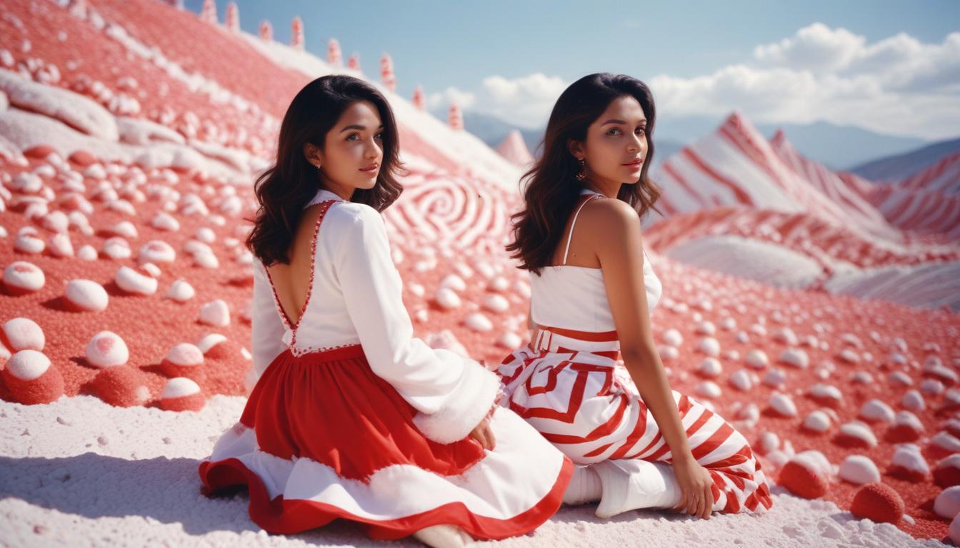 Two young women sit on a colorful, surreal landscape, smiling and enjoying the bright scenery under a clear blue sky.