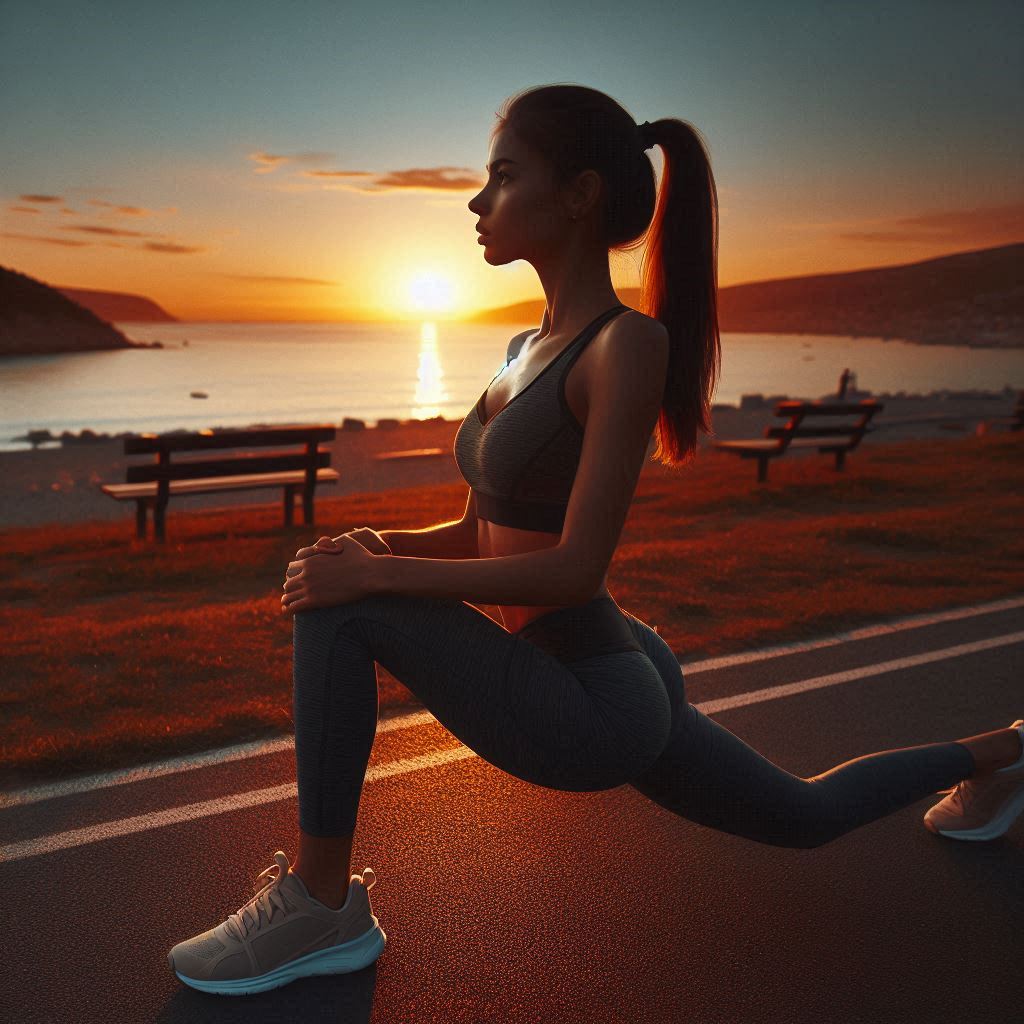 A woman stretches her body in a lunging position by the beach as the sun sets, casting a warm glow over the landscape and water.