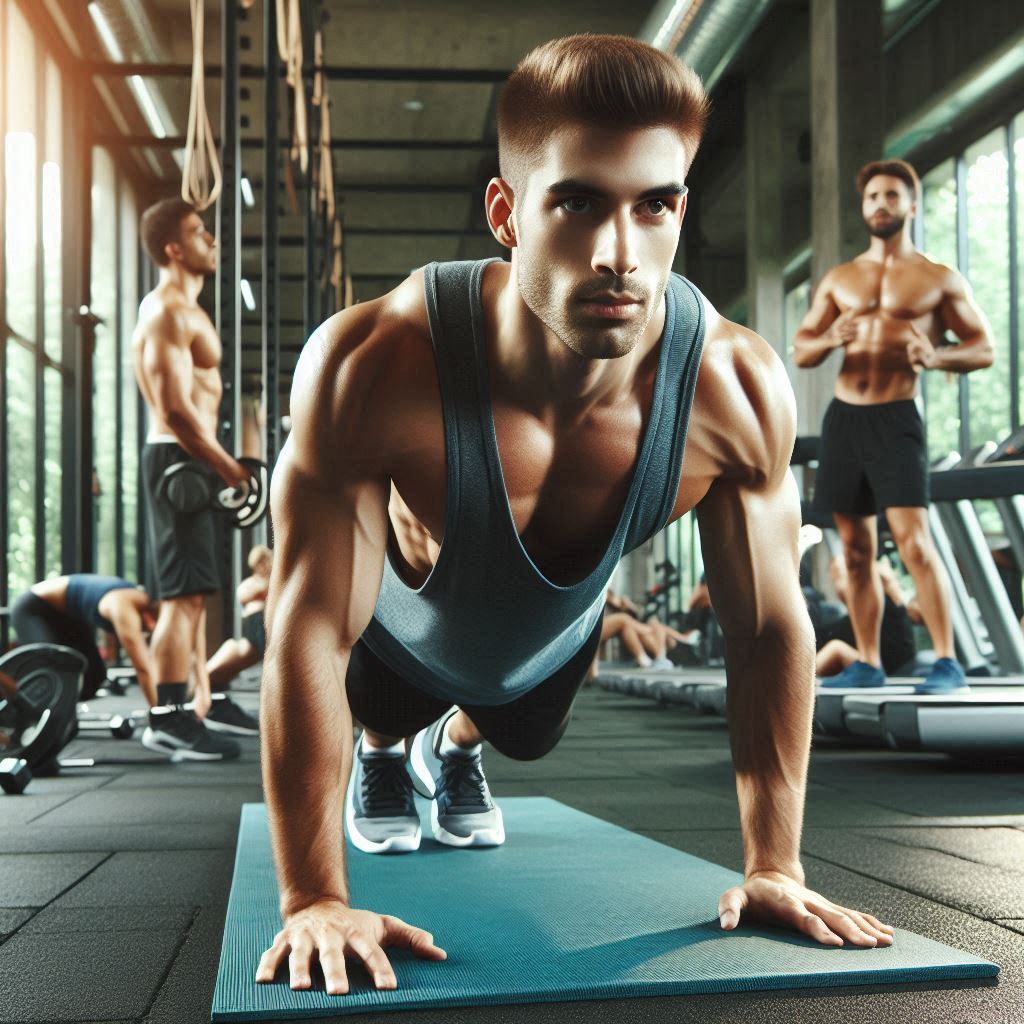 activity, energy, equipment, exercise, fitness, gym, health, indoor, lifestyle, man, mat, modern, muscle, physical, push-ups, routine, strength, training, weights, workout