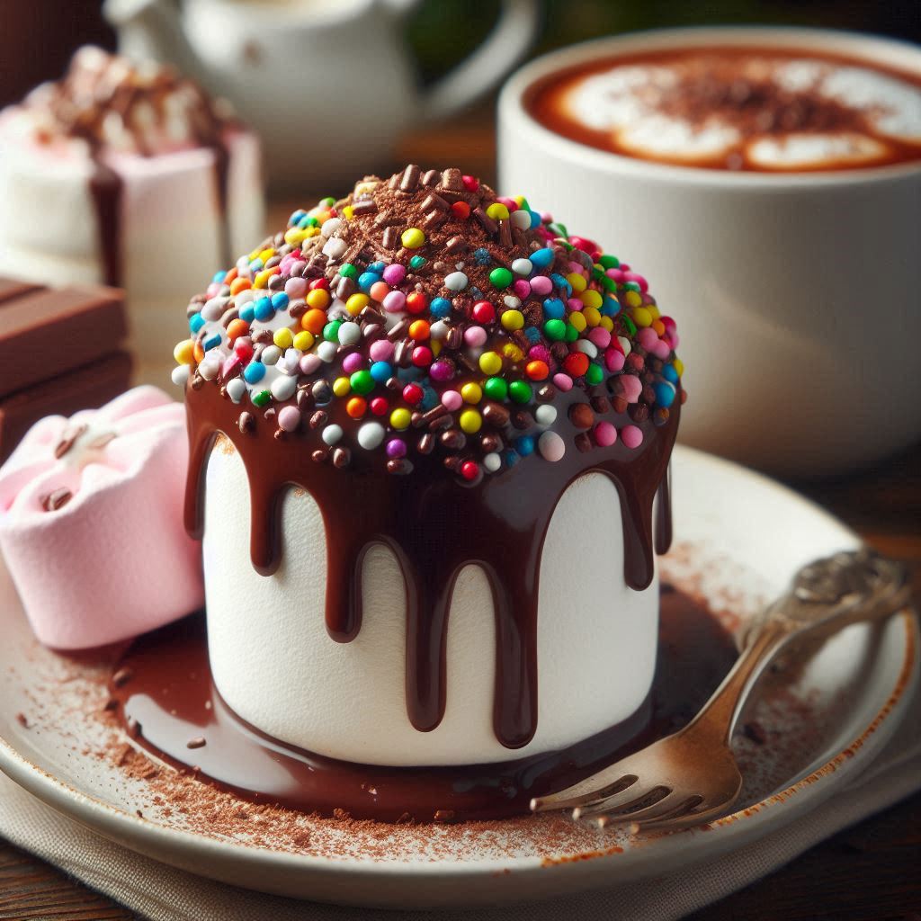 A delightful dessert features a fluffy cake topped with glossy chocolate and vibrant sprinkles, accompanied by a warm drink and marshmallows.