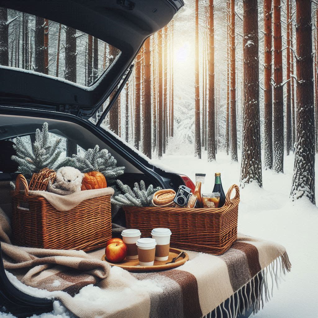 adventure, apples, baskets, blankets, coffee, cold weather, cozy setup, drinks, food, nature, outdoor, pine trees, relaxation, rustic, serene, snacks, snowy forest, tranquility, whimsy, winter picnic