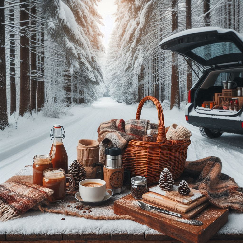 basket, blankets, car, cold weather, cozy, escape, forest, hot coffee, nature, outdoor, picnic, pinecones, serene, snacks, snow, thermos, travel, trees, warm drinks, winter