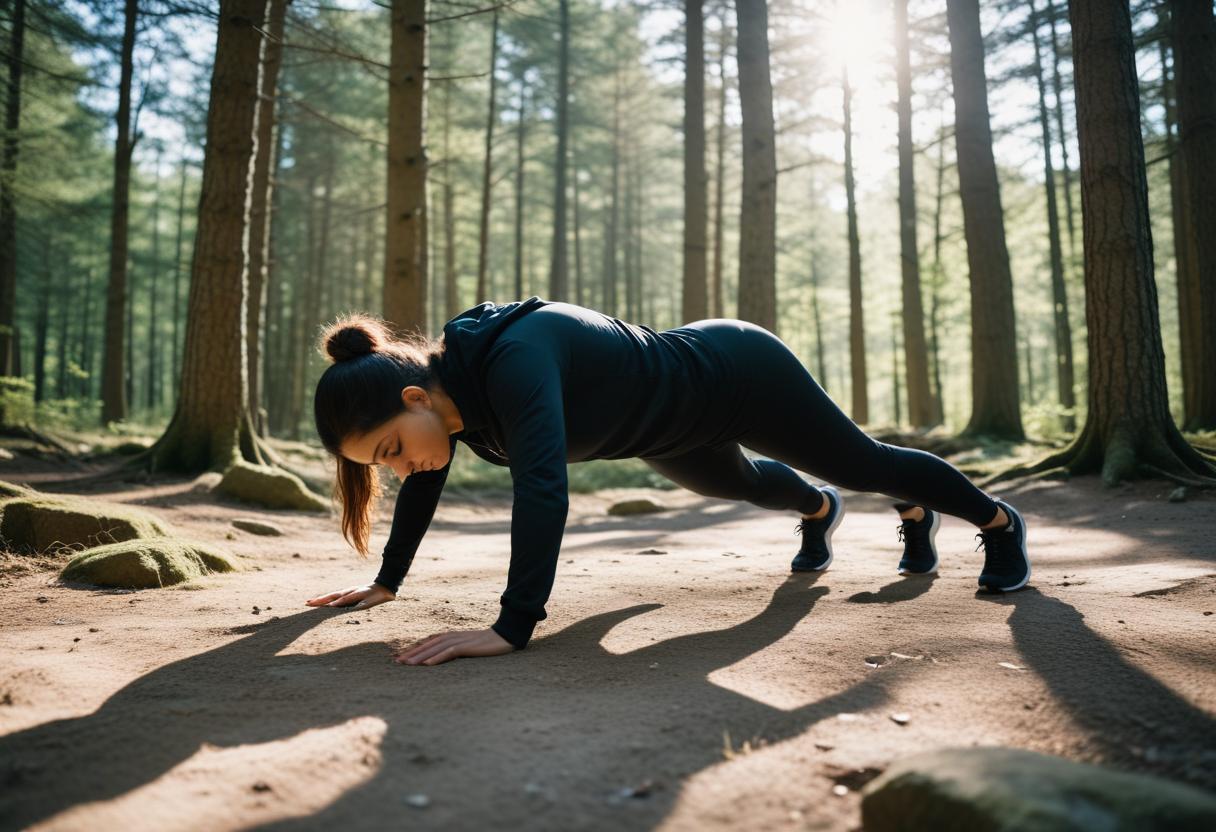 Woman exercising with push-ups in a forest setting