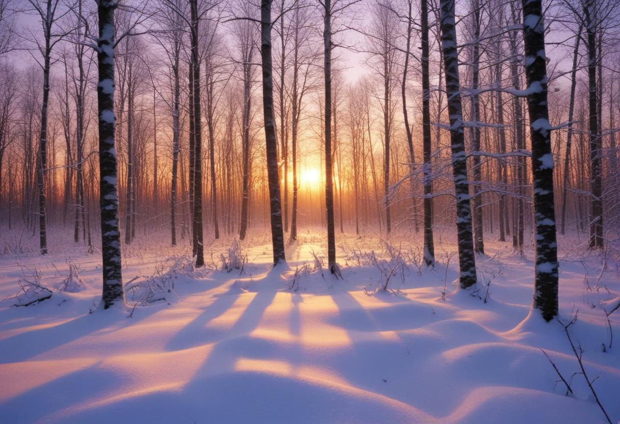 Sunlight filters through bare trees in a snowy forest as day turns to dusk, casting long shadows on the ground.