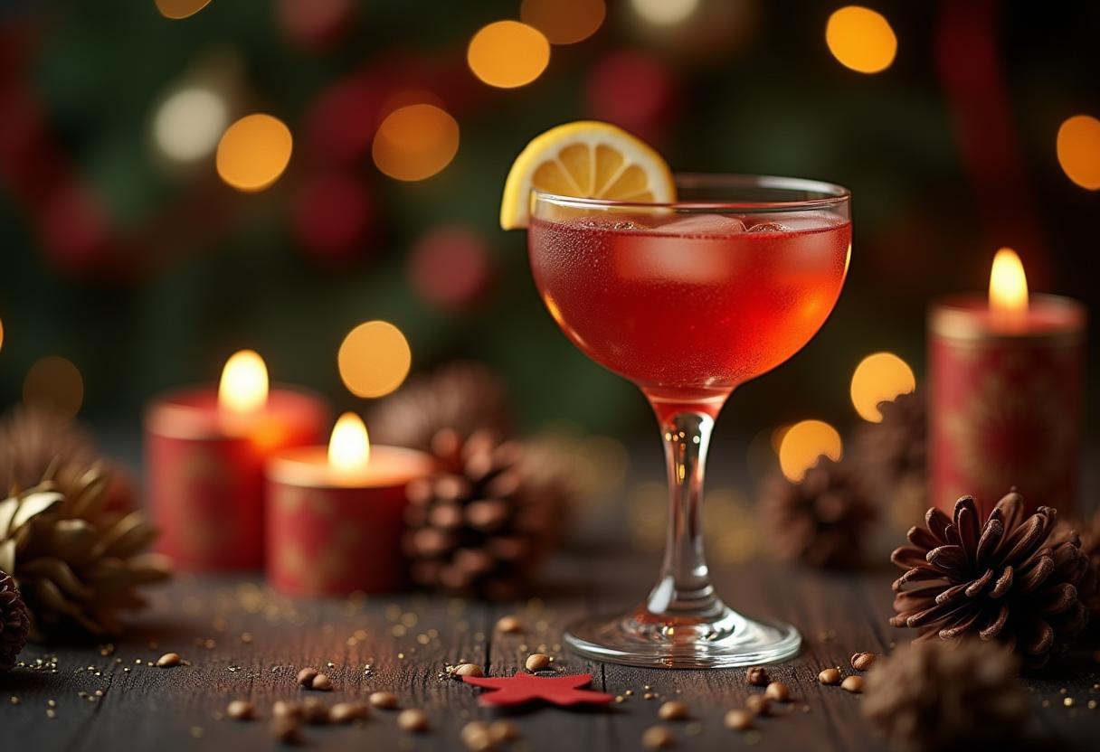 A vibrant cocktail glass garnished with a lemon sits on a wooden table surrounded by candles and pinecones, creating a holiday atmosphere.