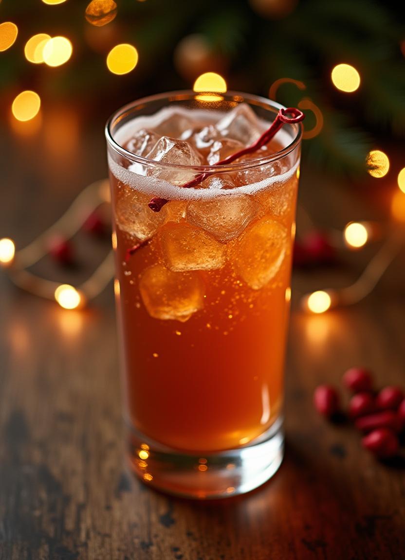 A tall glass filled with a fruity drink and ice sits on a wooden table. Warm holiday lights twinkle in the background, creating a cozy atmosphere.