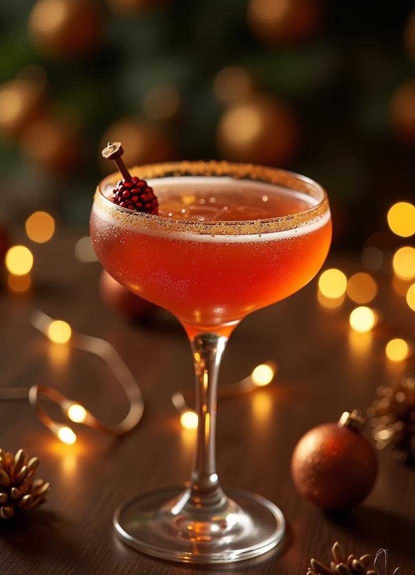 A beautifully crafted cocktail sits on a wooden table adorned with twinkling lights and holiday decorations, capturing a festive mood.