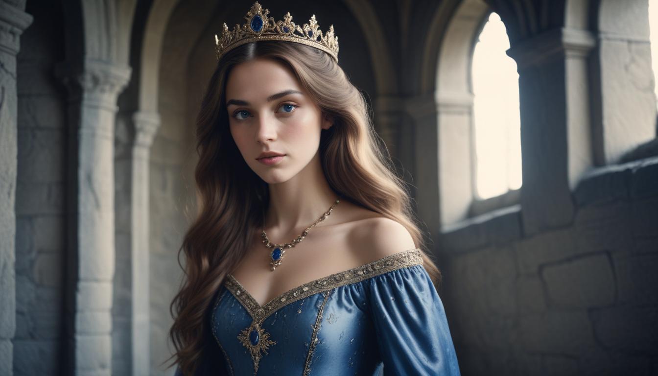 A young queen stands gracefully in an ancient castle, adorned in royal blue attire with a crown and jewelry, capturing a regal moment.