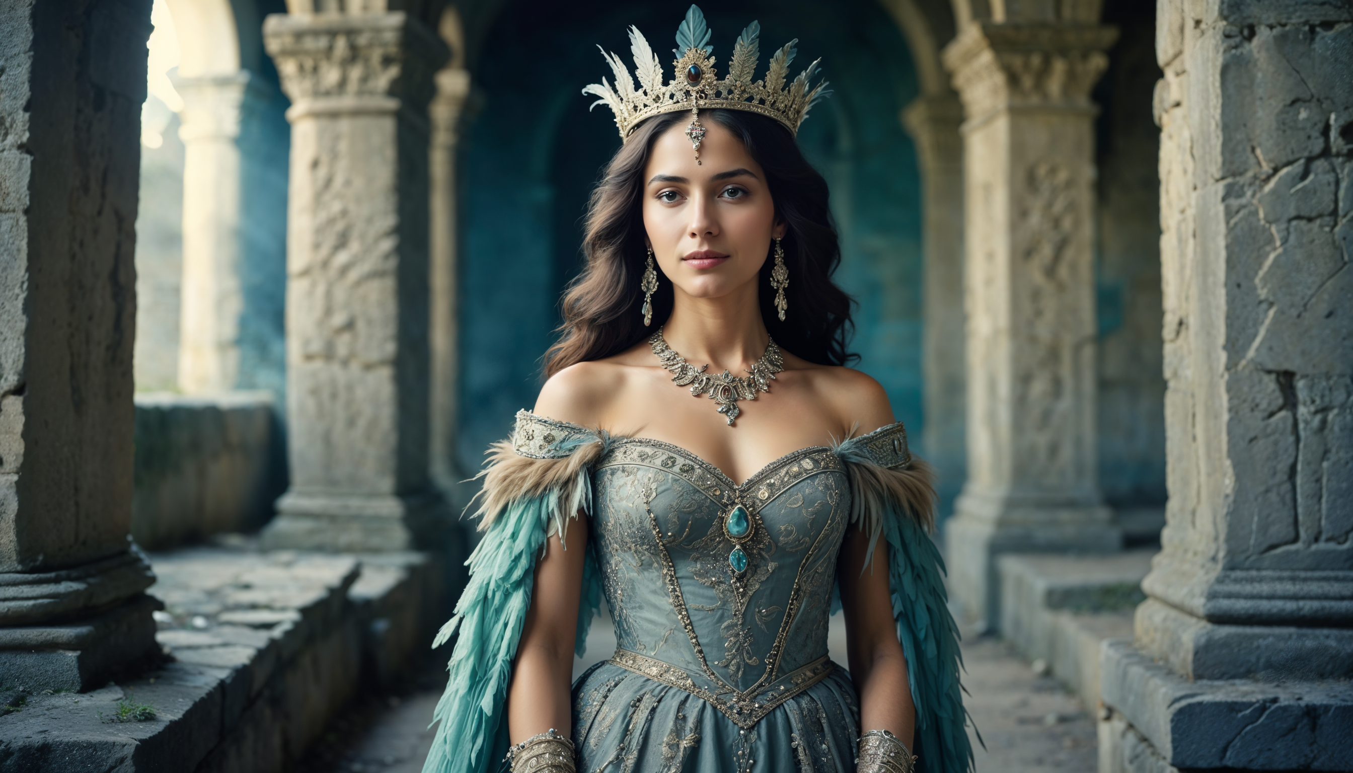 Elegant ice queen in a mystical castle setting