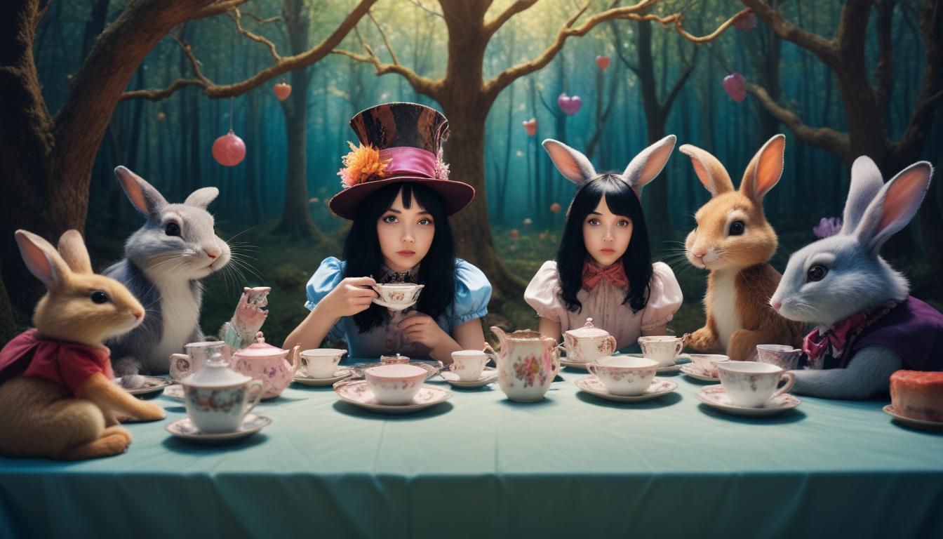 Two girls in costumes enjoy tea with rabbits at a whimsical forest table. Colorful decor and a serene atmosphere enhance the fantasy setting.