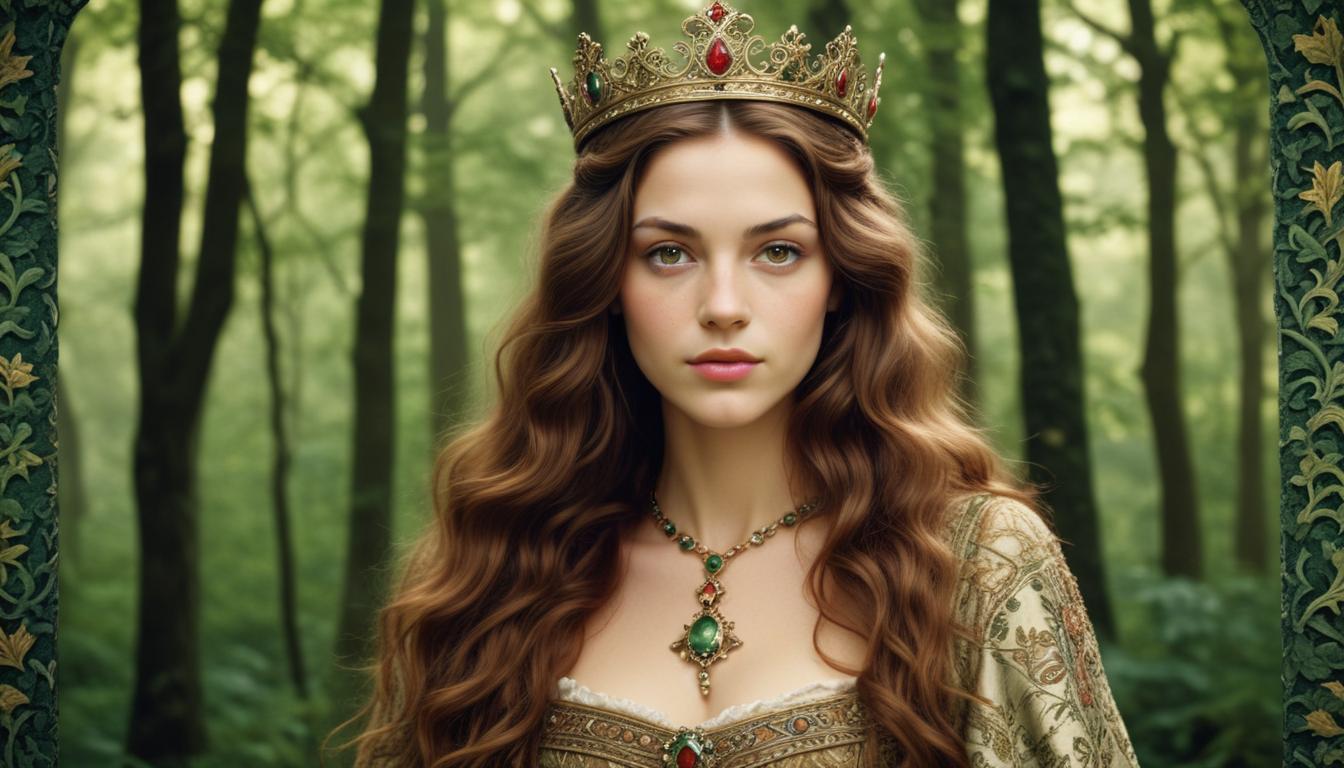 A regal queen with long, flowing hair and a crown poses gracefully among lush greenery, exuding an air of majesty and enchantment.