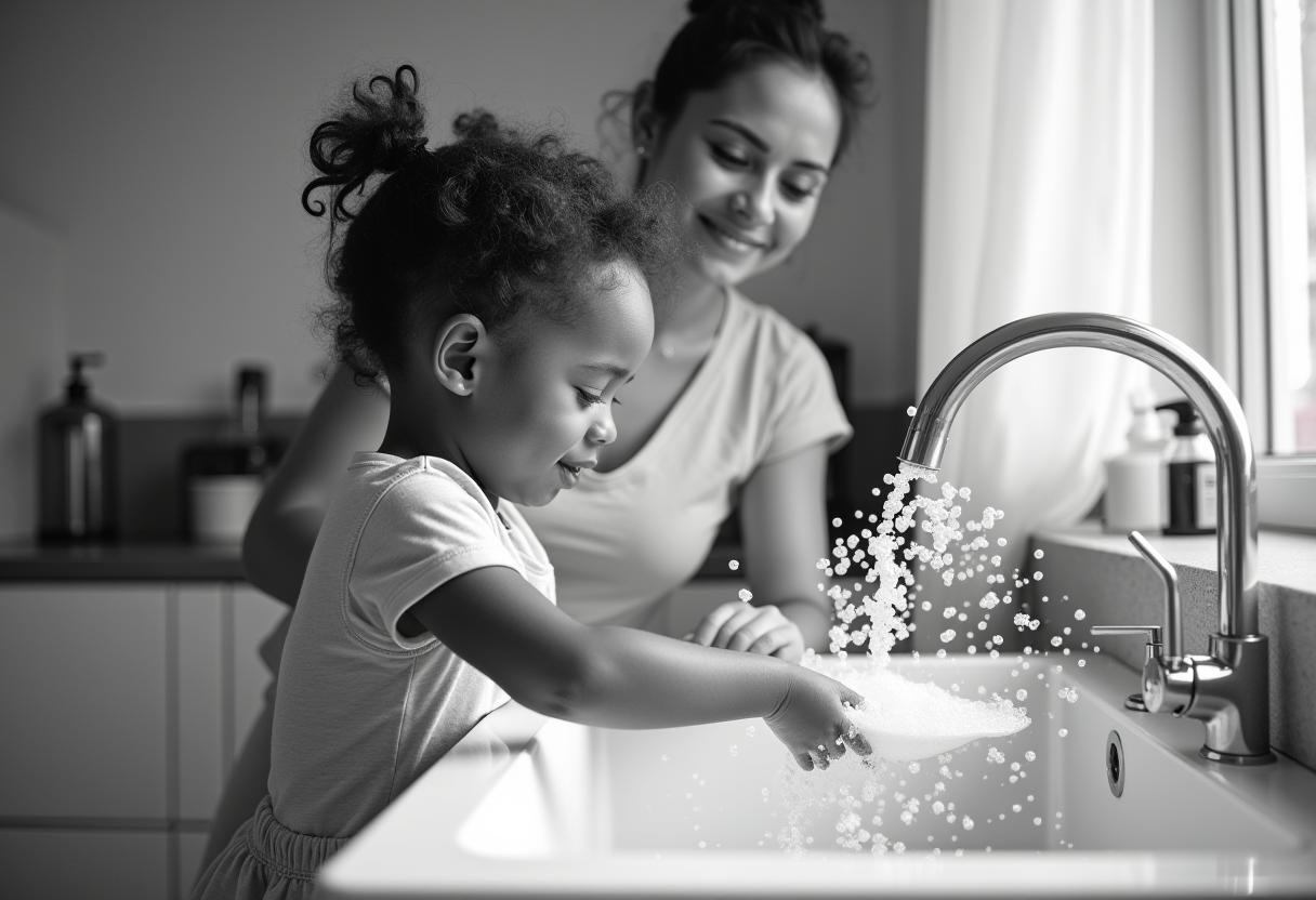 A mother and her young daughter smile as they wash dishes together in a cozy kitchen, enjoying a playful moment filled with joy.