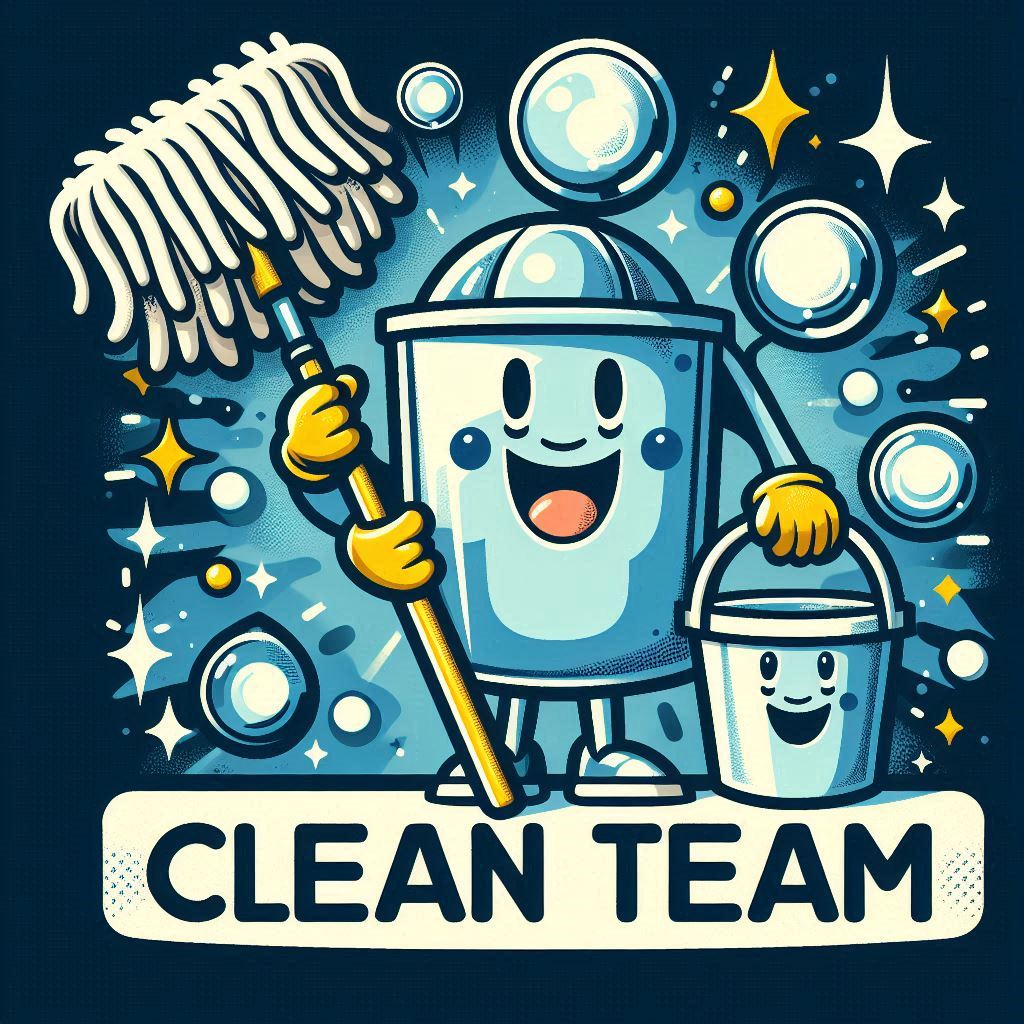 A cheerful cartoon mascot represents a cleaning team, holding a mop and bucket, surrounded by bubbles and stars, creating a playful atmosphere.
