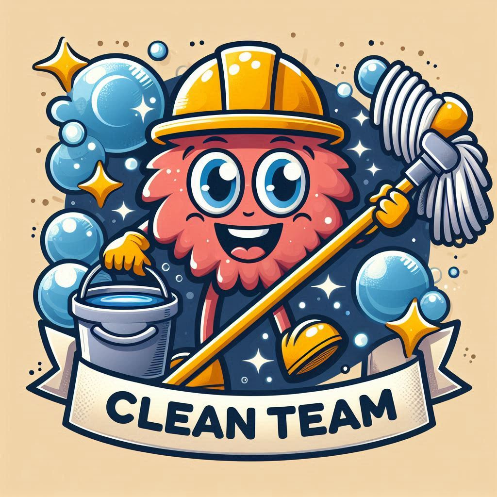 A cheerful character holds a mop and bucket, surrounded by bubbles and sparkles, symbolizing cleanliness and teamwork in a colorful design.