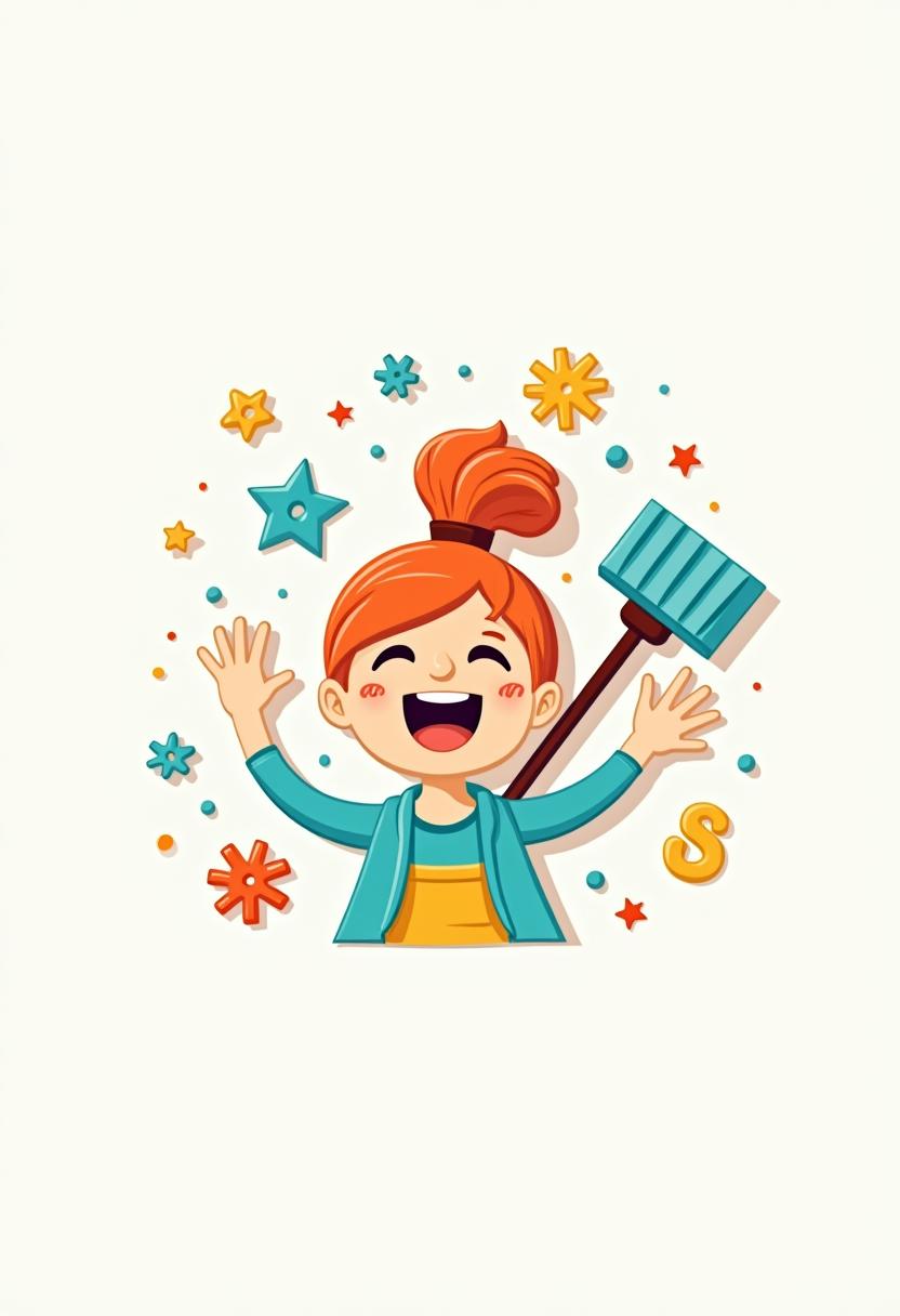 A young girl with red hair is smiling and raising her arms in joy while holding a broom surrounded by colorful stars and flowers.