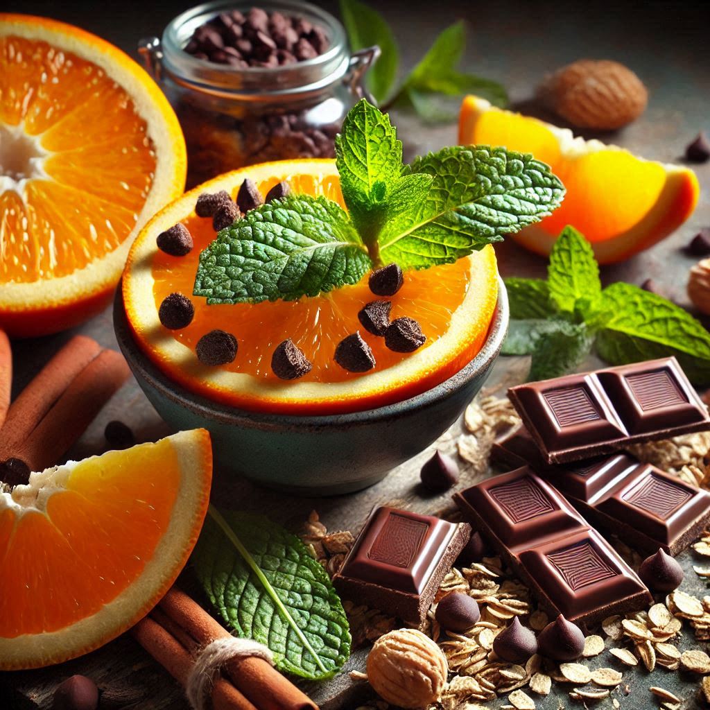 bowl, chocolate, cinnamon, colorful, dessert, food, fresh, garnish, healthy, indulgent, ingredients, mint, nuts, orange, slices, snack, summer, sweet, treat, vibrant