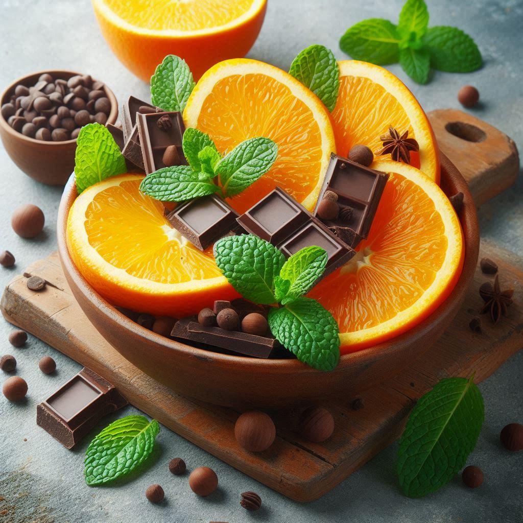 chocolate, citrus, culinary art, dark chocolate, dessert, food presentation, fresh fruit, gourmet, healthy snack, herbs, indulgent, mint, natural ingredients, nutrition, oranges, sliced oranges, sweet, texture, vibrant colors, wooden board