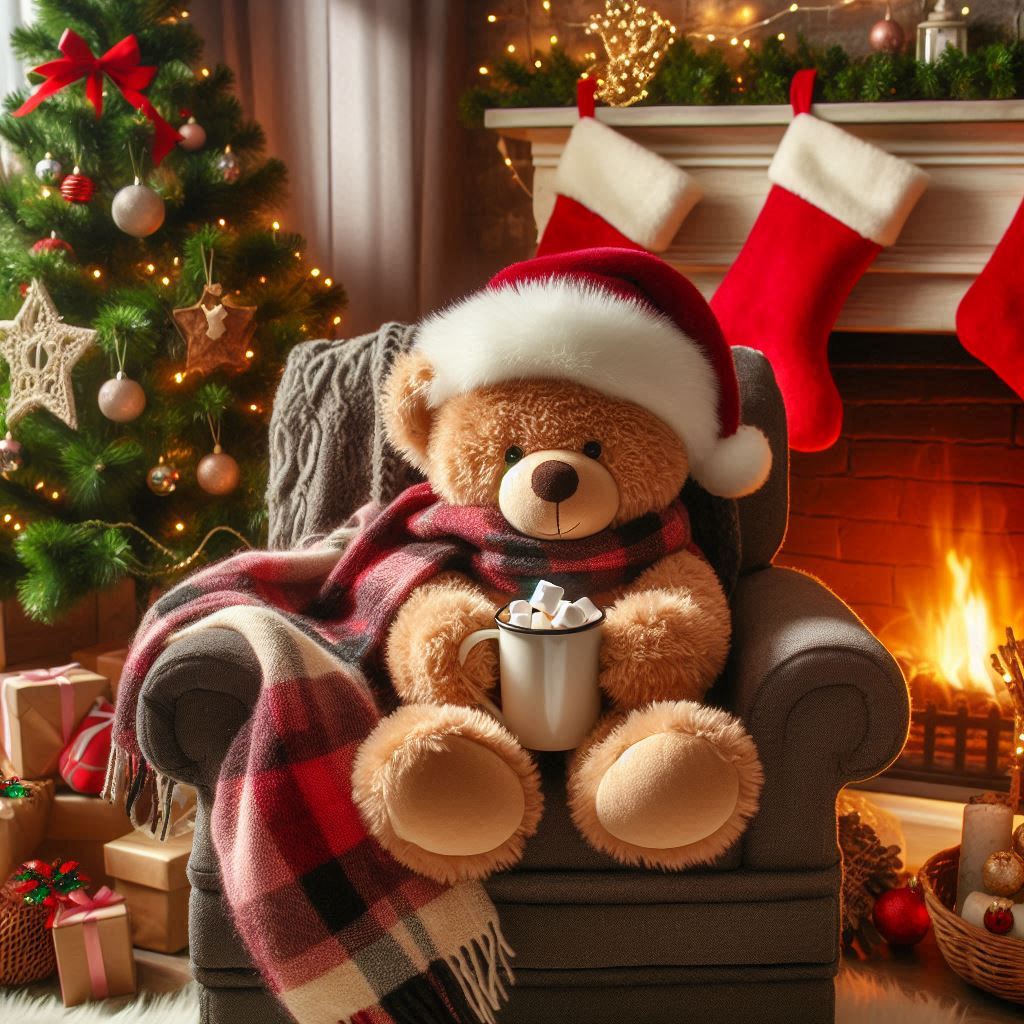 A teddy bear dressed in winter attire sits on a chair, holding a cup with marshmallows, surrounded by Christmas decorations and a warm fire.
