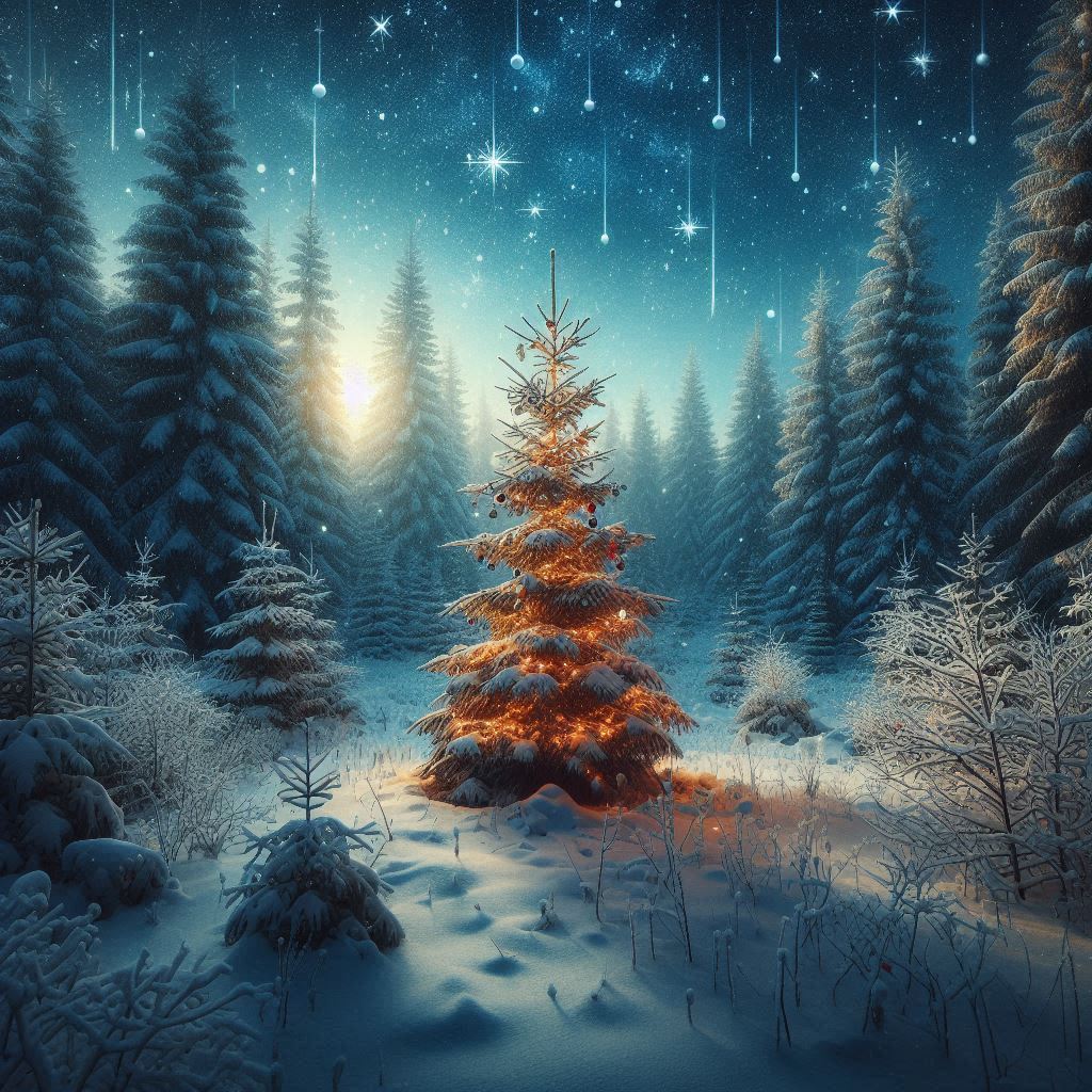 A serene winter landscape features a decorated Christmas tree surrounded by snow-covered evergreens, illuminated at twilight with falling stars.